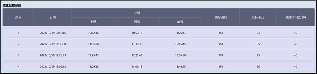 項目實施后,所有設備運行狀態實時監控與采集,硫化參數一鍵下發,準確便捷,減少員工的工作量,提升工作效率;對于超出限定溫度或壓力的設備,進行報警提示,并可按照不同的時間段分析設備運行狀態信息,尋求可優化的生產環節,避免資源閑置、浪費,提高生產率。