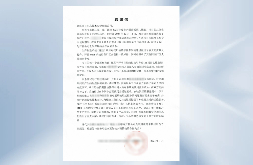 項目不僅提升了企業產能及效率,提高產品質量的,也為提升數字化制造水平提供了有益的經驗。項目上線后,獲得企業內部一致好評,其在感謝信中提到:“橡膠工段MES系統的成功同時受到了我廠其他車間的關注,高度贊揚了開目MES系統的專業性及開目公司人員的工作能力及服務態度。提高了我廠膠產品生產效率,降低了運營成本,提升了產品質量,為我廠實現車間數字化和信息化做出了重大貢獻。”